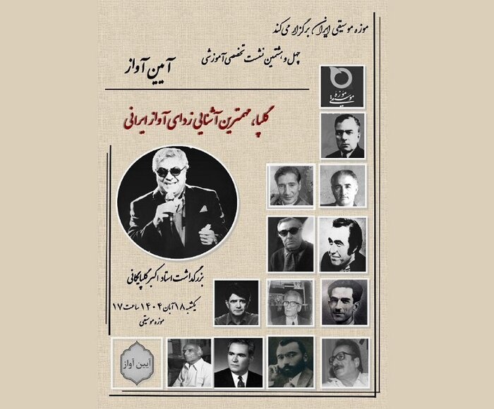 تهران- ایرنا- آیین بزرگداشت اکبر گلپایگانی با موضوع «گلپا؛ مهمترین آشناییزدای آواز ایران» با حضور و پژوهشگران این حوزه در موزه موسیقی برگزار میشود.